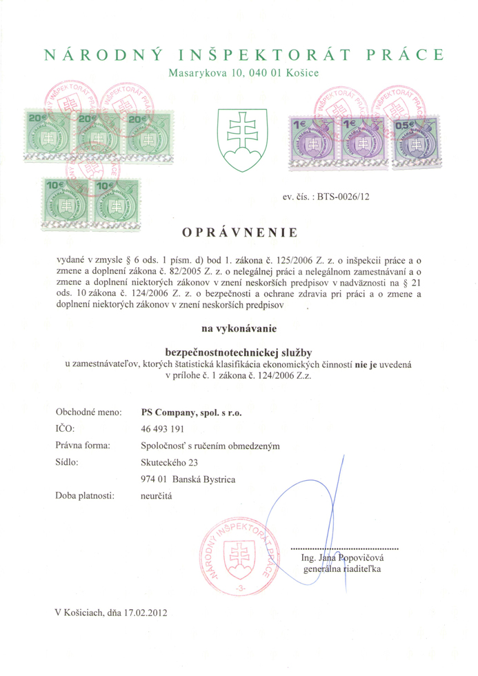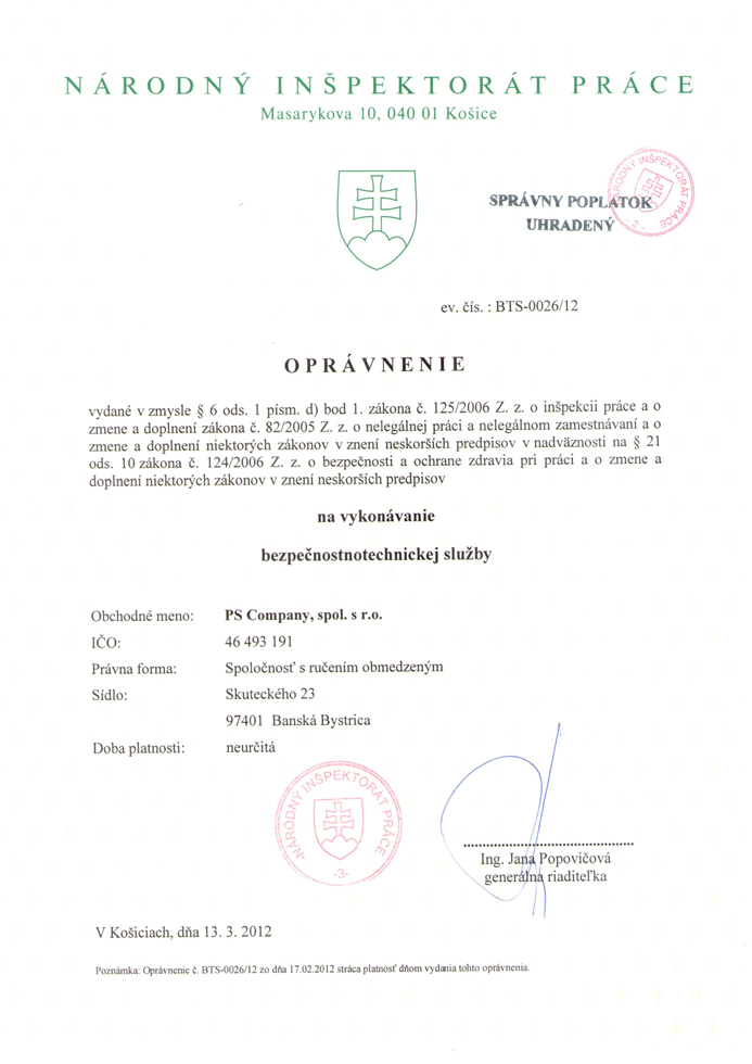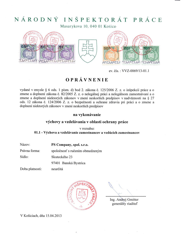 Bezpečnosť a ochrana zdravia pri práci1.) Vykonanie vstupnej prehliadky za účelom posúdenia stavu bezpečnosti práce u objednávateľa s následným vystavením protokolu so zistenými skutočnosťami a nedostatkami. 2.) Vypracovanie dokumentácie BOZP: